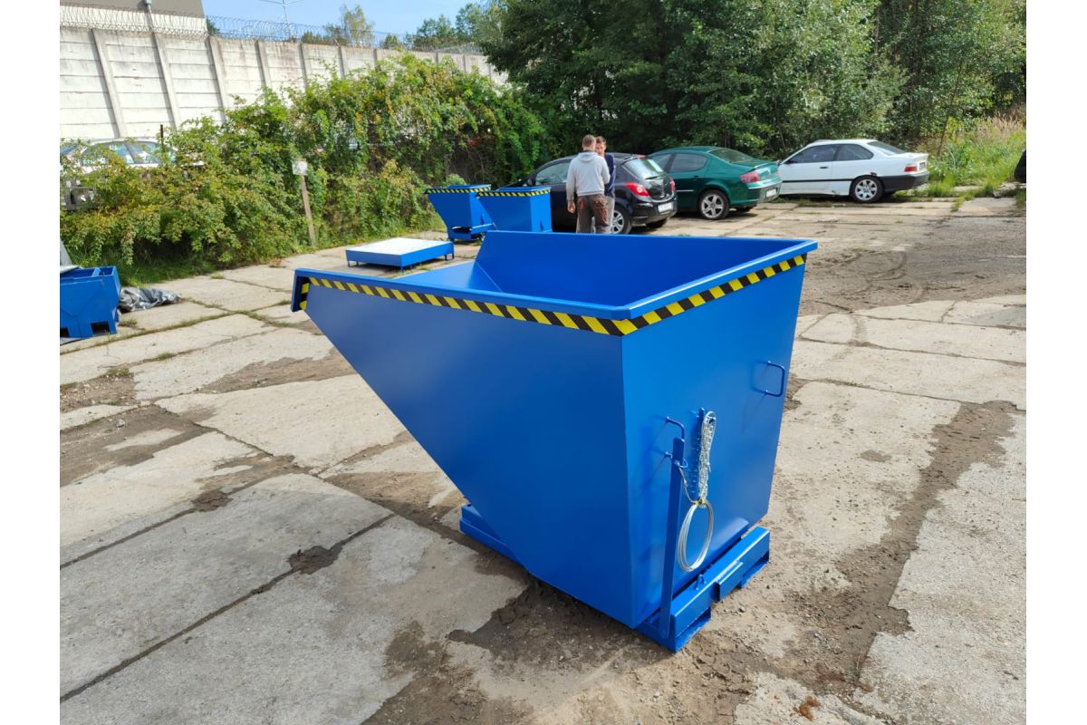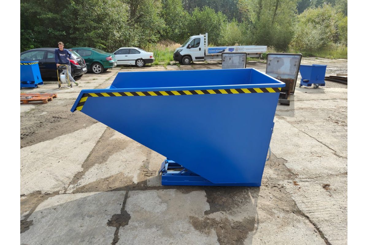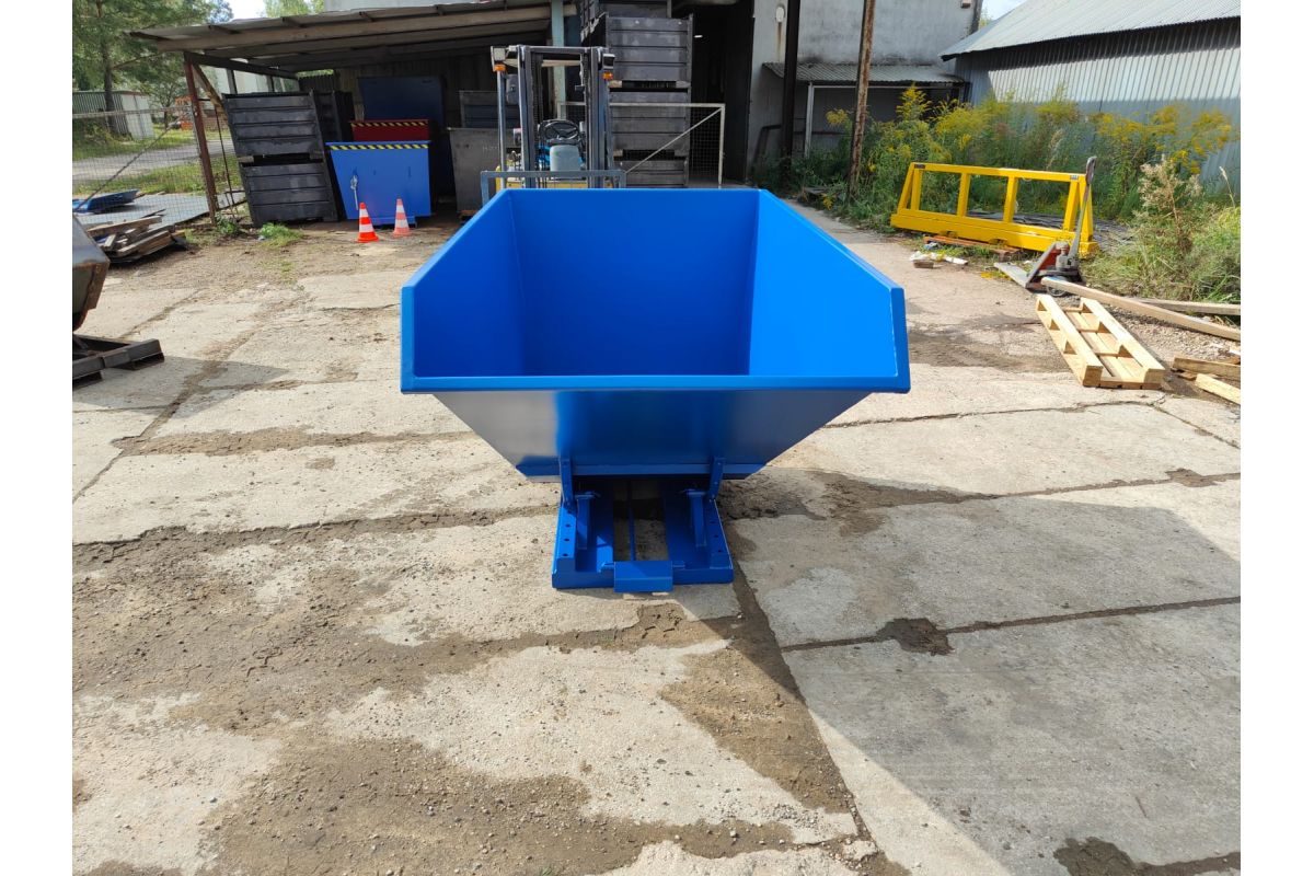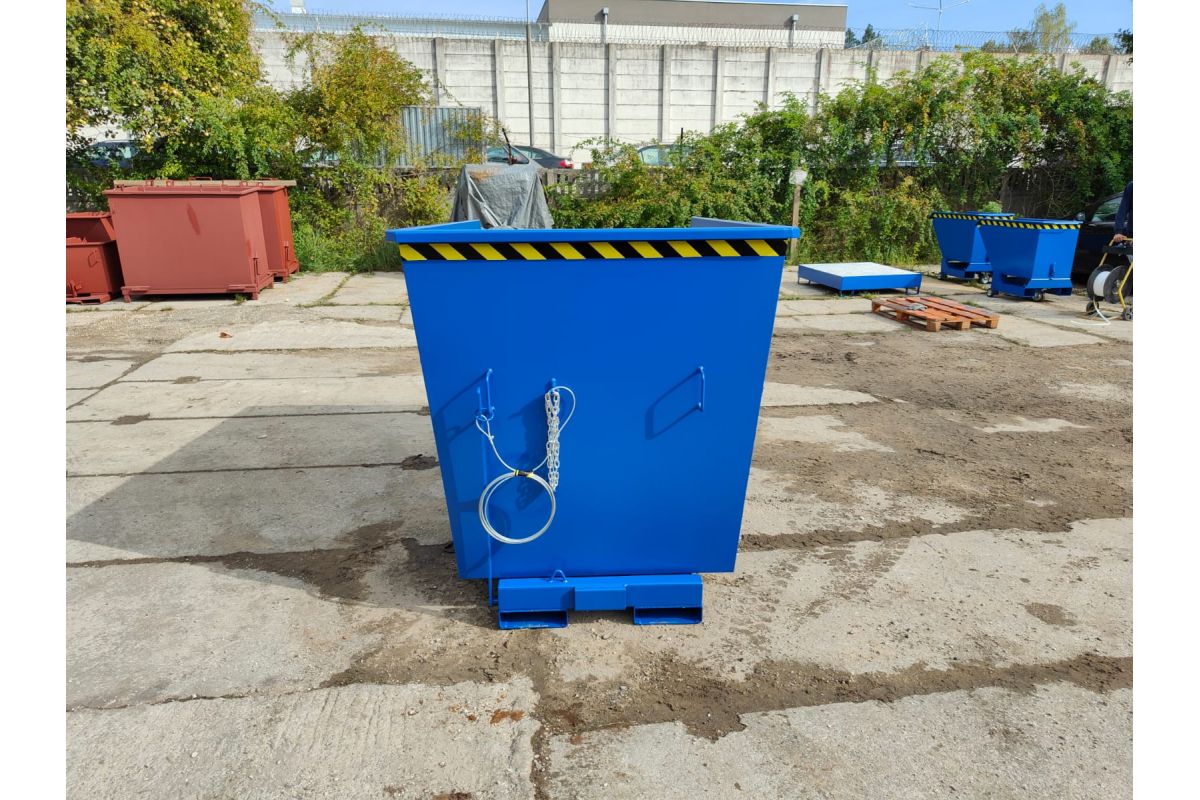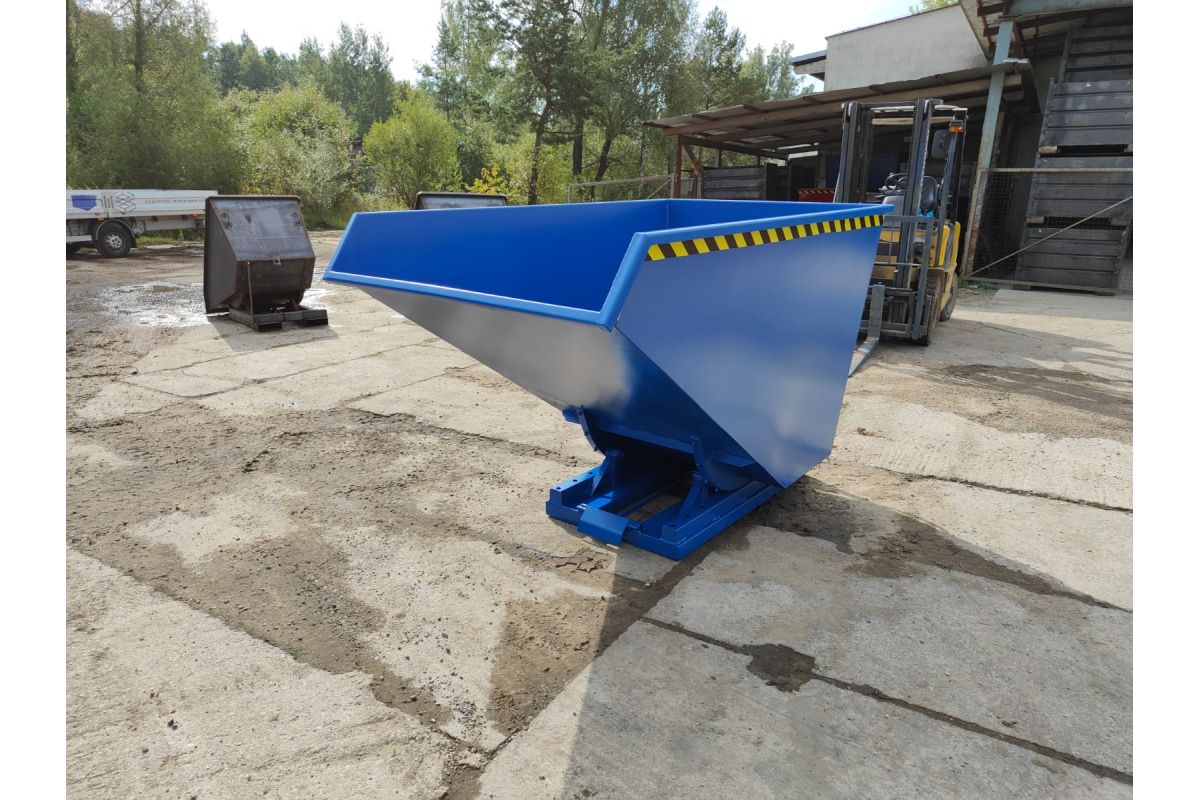 Koleba samowyładowcza NTK to bardzo solidny zbiornik do wózków widłowych. Wykonany jest z najwyższą starannością z blachy 3 mm w części zbiornika oraz 4 mm w podstawie. Górna krawędź dla stabilności konstrukcji jest wzmocniona. Kontener jest spawany dwustronnie dzięki czemu konstrukcja jest zwarta i szczelna. Koleba została wyposażona w podwójny mechanizm wyładowczy. Zbiornik można opróżnić przy użyciu zbijaka czołowego bądź dźwigni znajdującej się na tylnej ścianie. Na niej znajduje się również zabezpieczenie przez niepożądanym odbezpieczeniem podczas transportu pojemnika. Po wyładunku przy odchyleniu wideł, pusty pojemnik wraca do pozycji początkowej i zostaje zablokowany. Zbiornik jest malowany natryskowo farbą poliuretanową. Zapobiega to korodowaniu powierzchni koleby oraz umożliwia łatwe czyszczenie i konserwację.