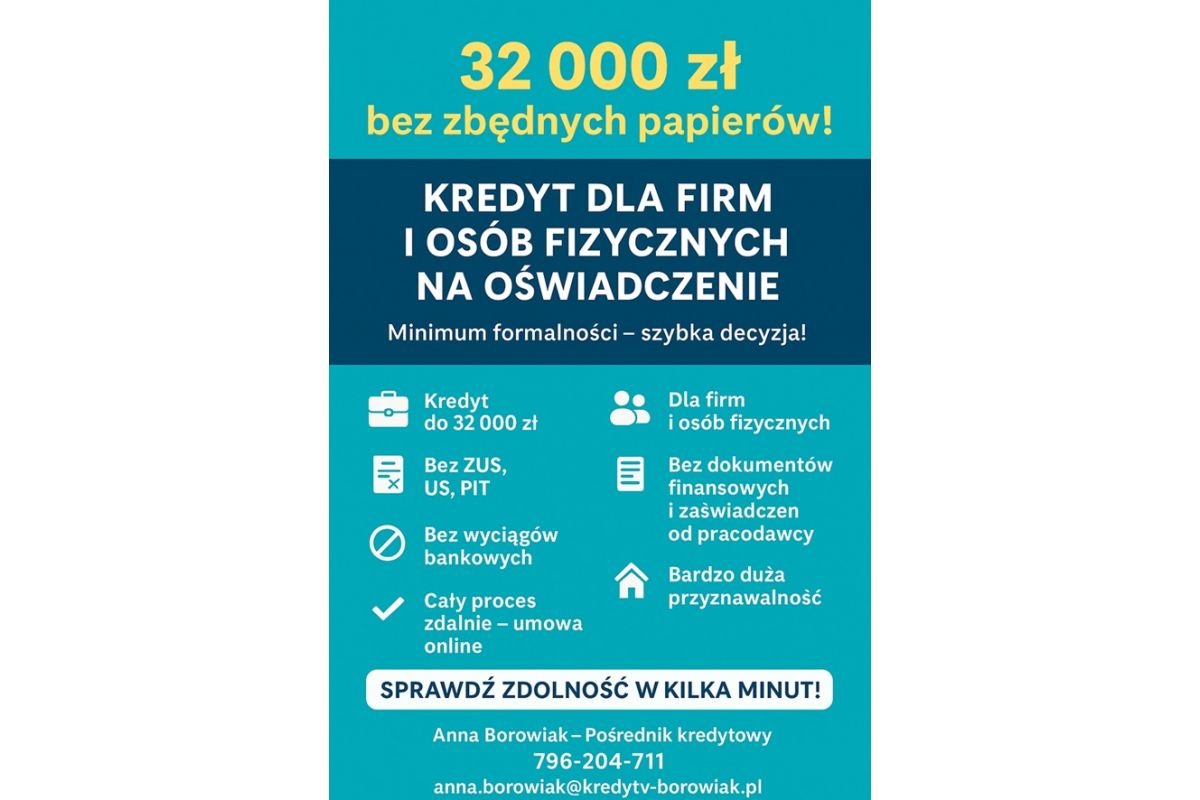 KREDYT DLA FIRM I OSÓB FIZYCZNYCH NA OŚWIADCZENIE – do 32 000 zł