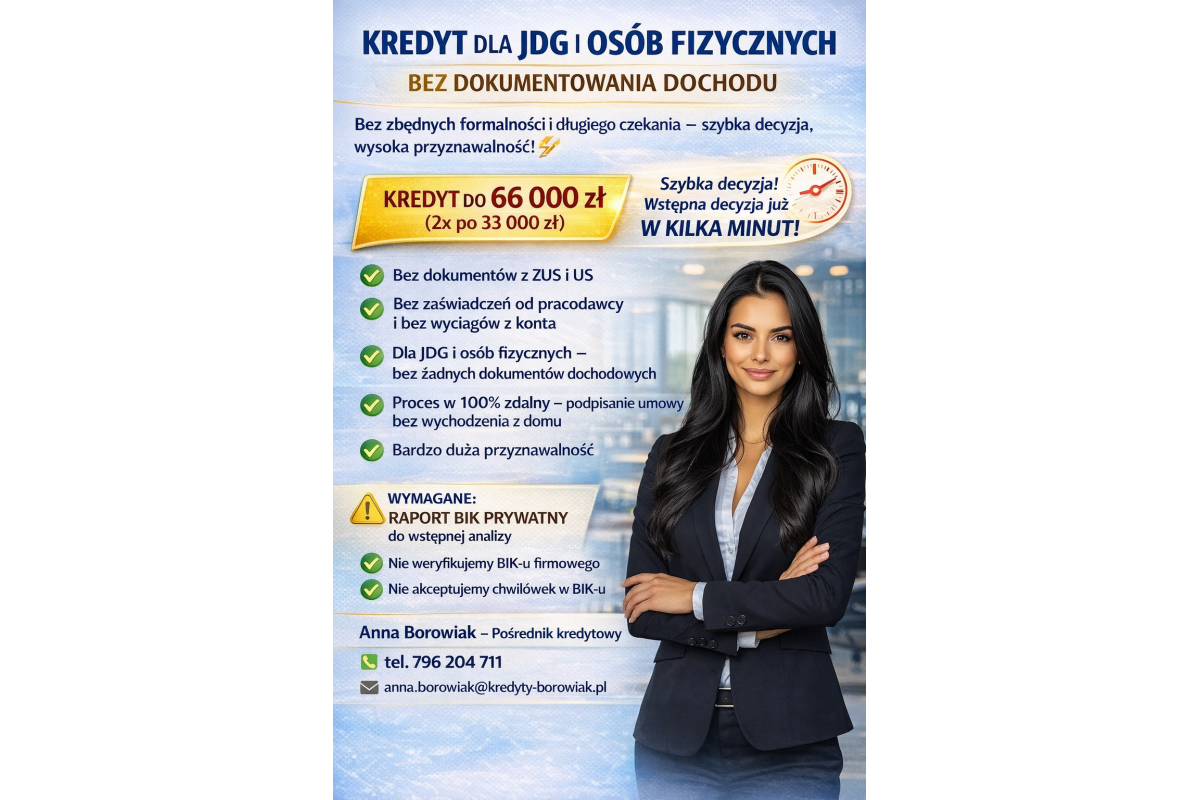 KREDYT DLA JDG I OSÓB FIZYCZNYCH BEZ DOKUMENTOWANIA DOCHODU