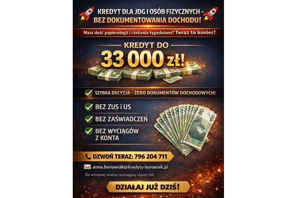 KREDYT DLA JDG I OSÓB FIZYCZNYCH – BEZ DOKUMENTOWANIA DOCHODU!